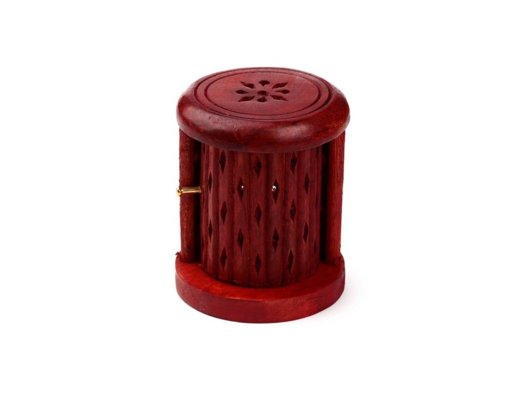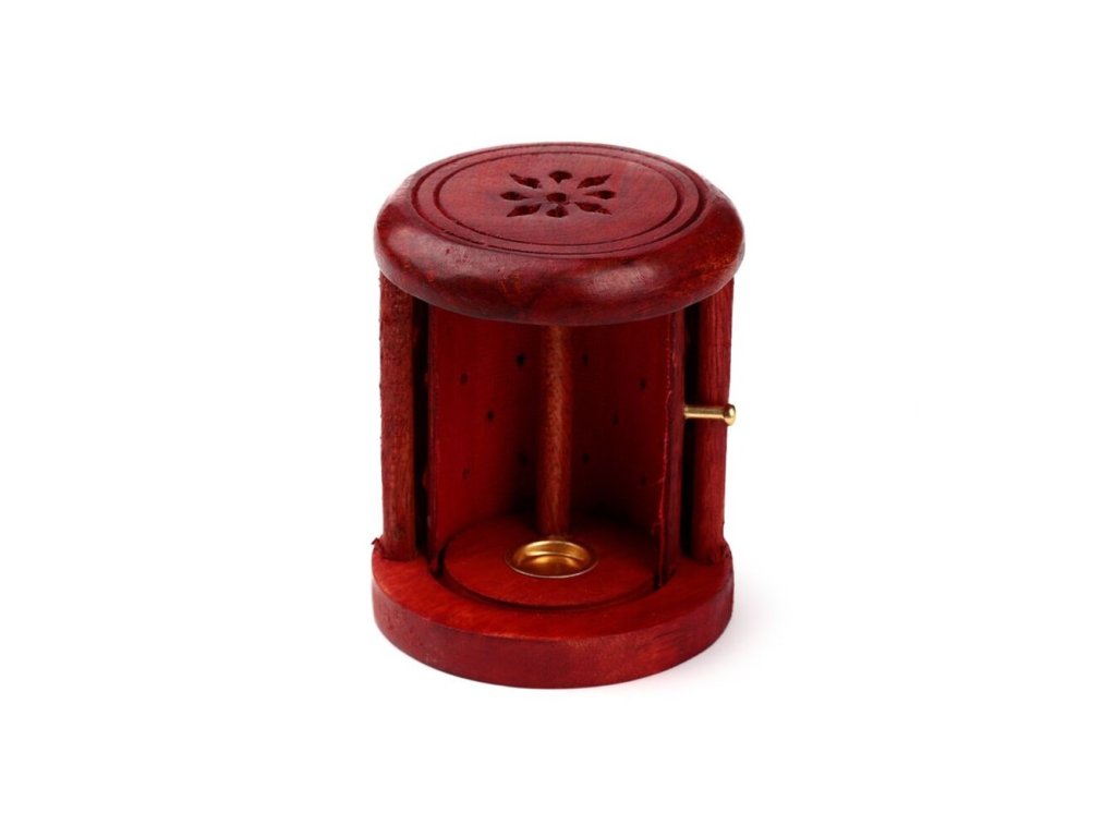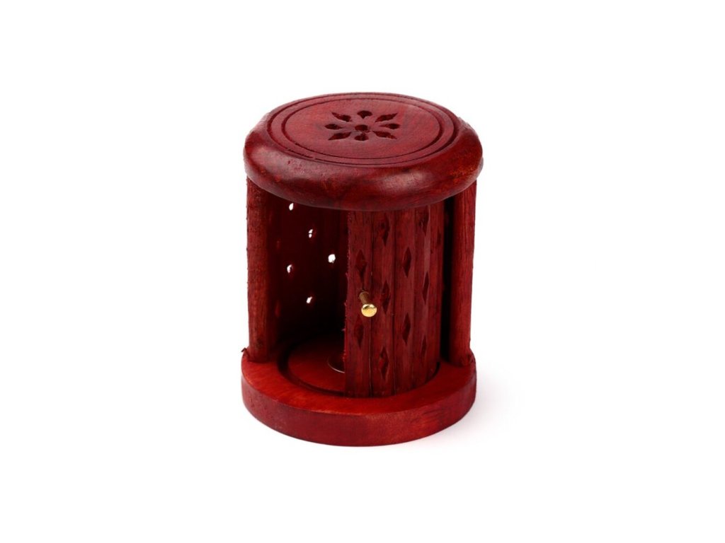 Füstölőtartó faragott henger mangófából. Kúpfüstölők égetésére alkalmas kézzel készült termék, nyitható kis ajtóval. A mangófát Indiában szent fának hívják, a legenda szerint egy mangófával övezett liget volt Buddha pihenőhelye is. A mangófa keményfa, azonban jelentősen könnyebb, mint hasonló keménységű társai.