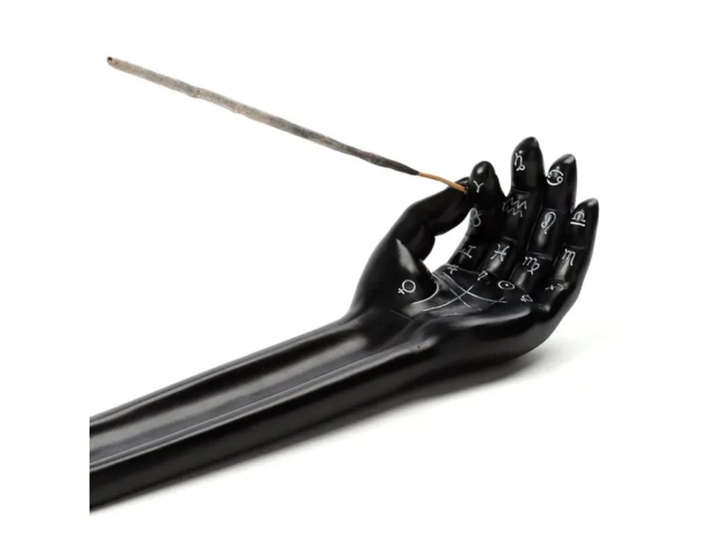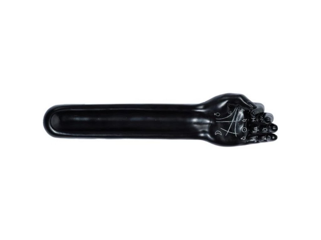Vigyen egy csipetnyi misztikumot otthonába ezzel a stílusos, fekete gyantából készült füstölő tartóval, amely nyitott tenyér alakú. Tenyérjóslásra emlékeztető szimbólumokkal díszített Egyszerre praktikus és szimbolikus, így tökéletes spirituális gyakorlathoz vagy stílusos otthoni dekorációhoz.