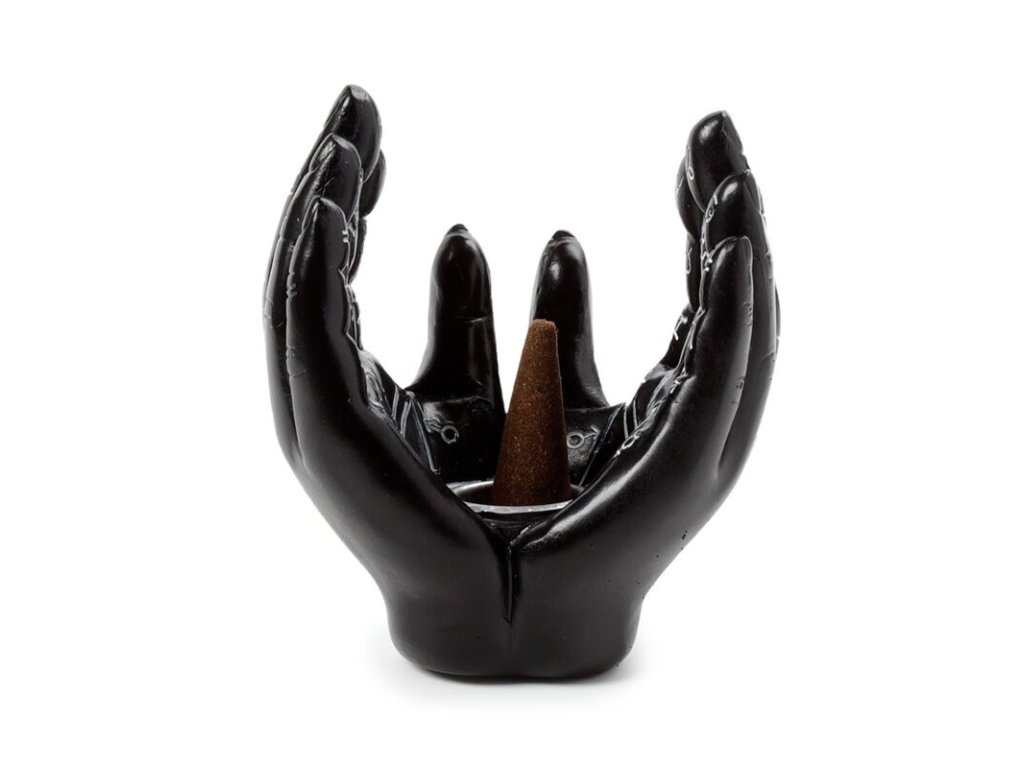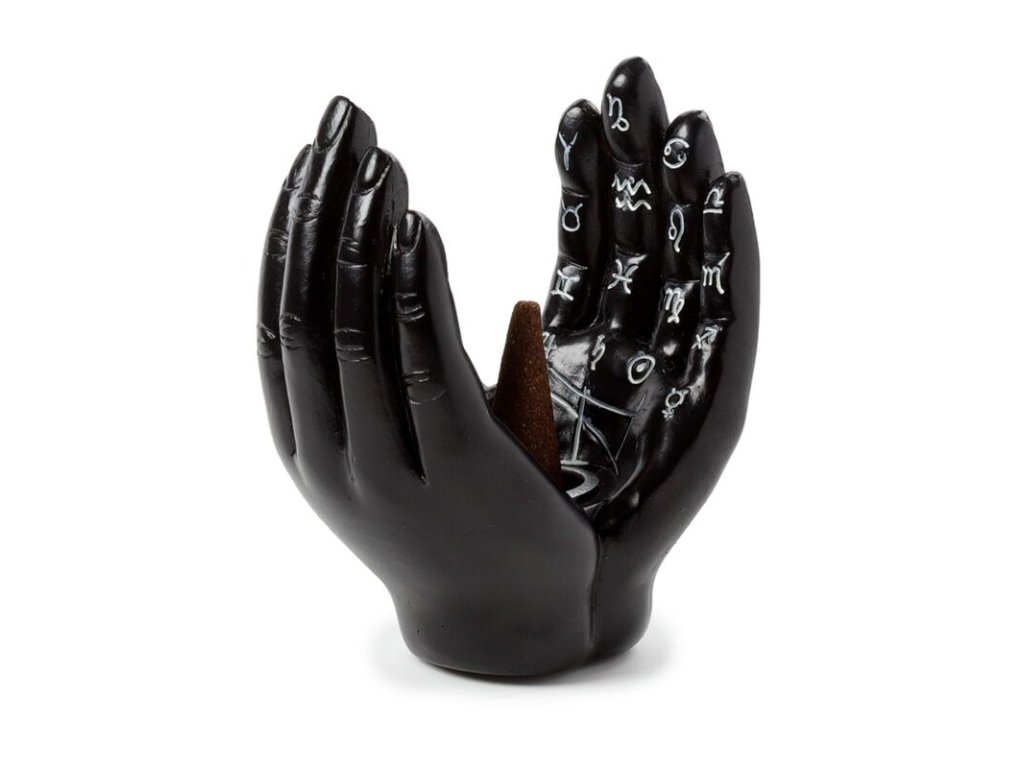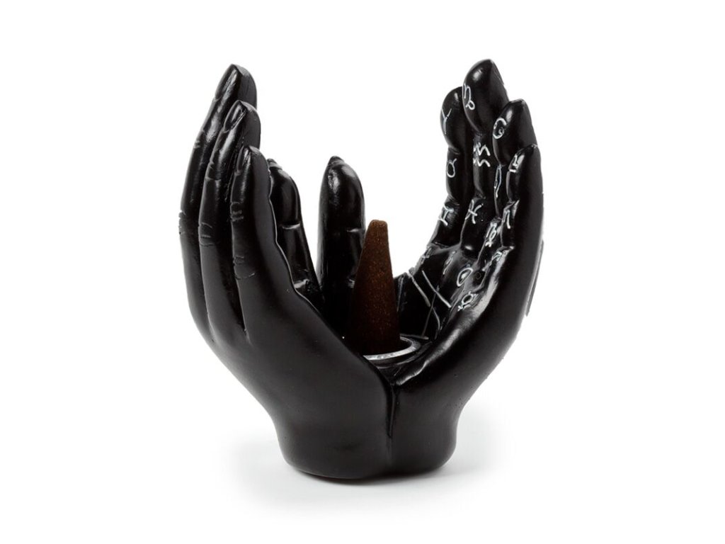 Ez a tálka kifejezetten kúp alakú füstölőkhöz készült, és nyitott tenyerek formájú dizájnja mantrikus vagy tarot motívumokat idéz, amelyek a tenyérjóslás vagy spirituális kézpozíciók világát hozzák közel.